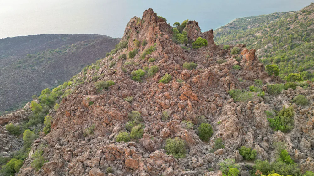Το φιδίσιο δρομάκι, κινείται πάνω στη καμένη από χρόνια λάβα κι αυτό από μόνο του αποτελεί την εμπειρία! Και όταν φτάσεις στο τέρμα της διαδρομής, θα αντικρίσεις ένα ρήγμα, το οποίο πιθανότατα σχηματίστηκε την τρίτη φάση της έκρηξης τον 3ο αιώνα π. Χ. Η θέα προς τον Αργοσαρωνικό είναι φανταστική κι αν πετύχεις τη δύση του ηλίου, έχεις κερδίσει λαχείο!
