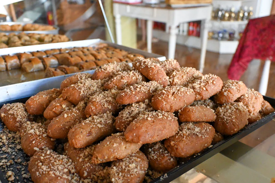 Δοκίμασε οπωσδήποτε παραδοσιακούς σαμουσάδες που στην πραγματικότητα αποτελούν τη βυζαντινή εκδοχή του μπακλαβά, κουραμπιέδες με μοσχομυριστό βούτυρο και τραγανά μελομακάρονα. Δυνατή γεύση (και πολύ αγαπημένη) έχει ο μπακλαβάς με την ινδική καρύδα και τα σιροπιαστά με το φιστίκι Αιγίνης!