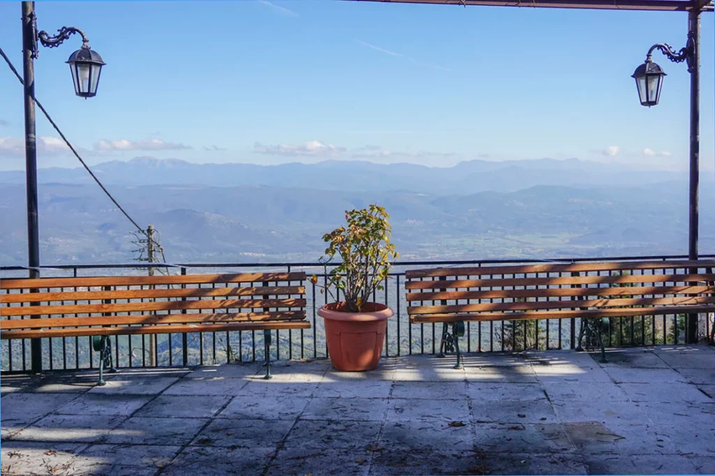 Νιώθεις πως αν κρεμαστείς με μια κουπαστή κι αφήσεις τα χέρια, θα πέσεις στο κενό, εκεί που απλώνεται ολάκερη η κοιλάδα του Ευρώτα. Αν πάλι κοιτάξεις πίσω σου, θα αισθανθείς φρουρό ένα ολόκληρο βουνό. Απέναντι ορθώνεται ο Πάρνωνας, άλλος ένας ακοίμητος φρουρός.