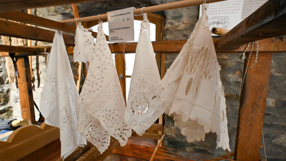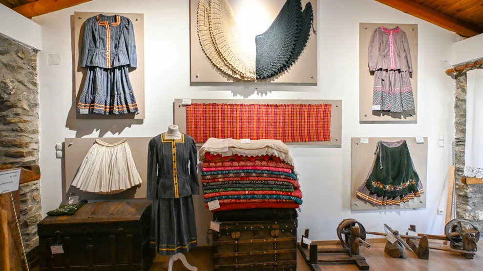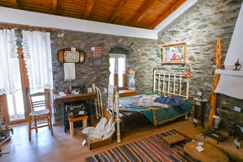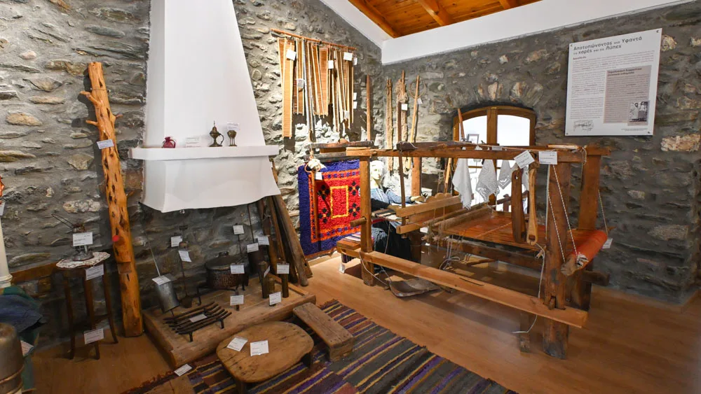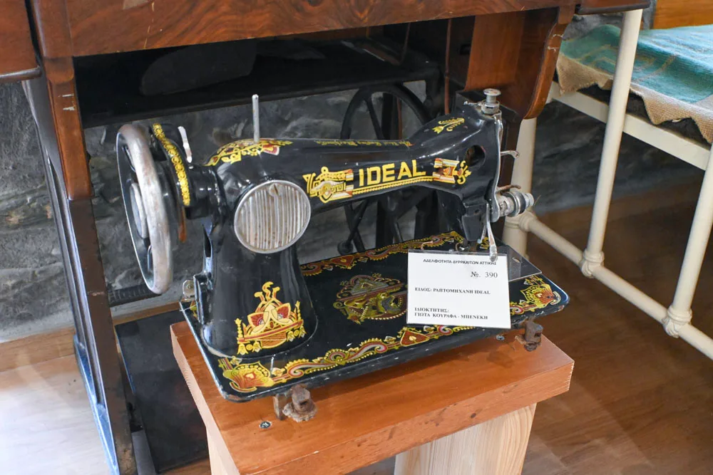 Στον πρώτο όροφο θα βρεις, ένα αληθινό δωμάτιο από το παρελθόν, με τζάκι και αργαλειό. Ανάμεσα στα εκθέματα θα θαυμάσεις σκεπάσματα, φορεσιές, ραπτομηχανές, εργόχειρα, λάμπες και πολλά ακόμη. Να ξέρεις όμως, πως όση ώρα κι αν καθίσεις να τα περιεργαστείς, ποτέ δεν είναι αρκετή.