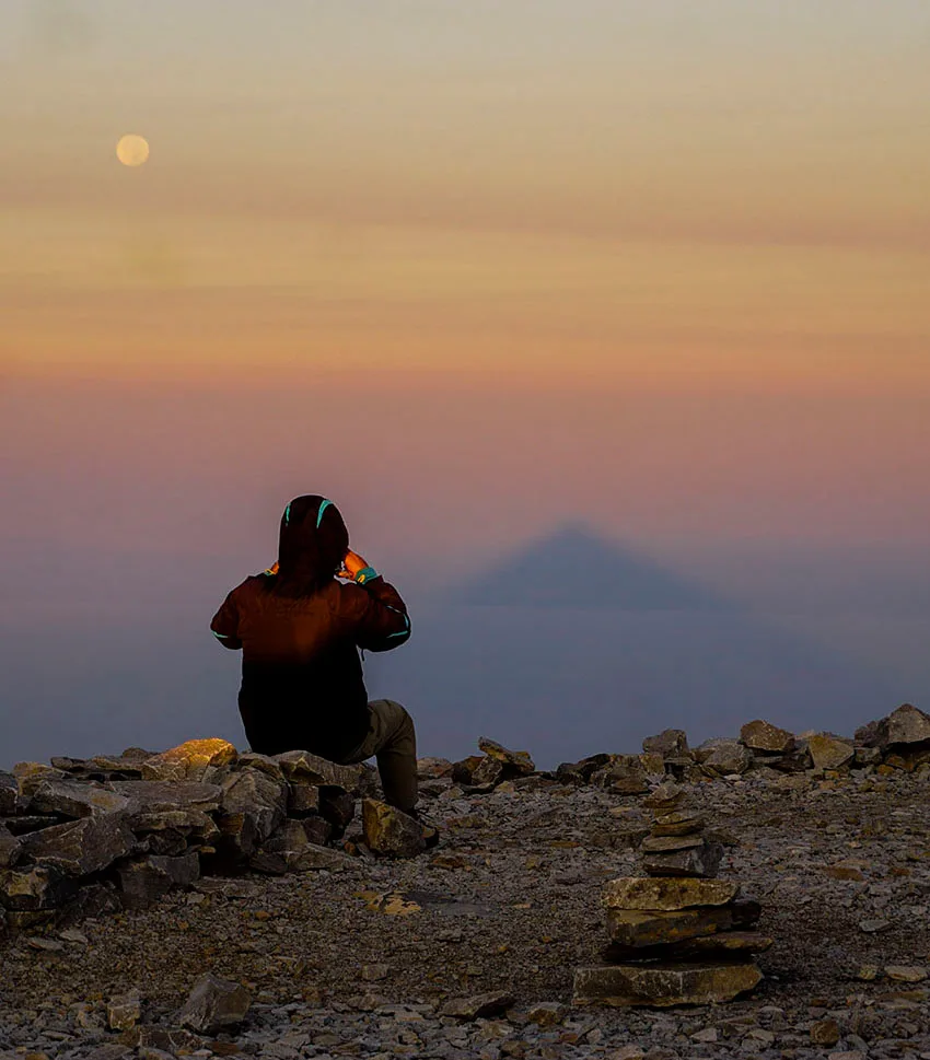 Αν η ανάβαση γίνει πριν ξημερώσει, τότε από την κορυφή θα δεις ένα μικρό θαύμα να λαμβάνει χώρα. Στο απέραντο κενό, μια πυραμίδα θα γεννηθεί μέσα από τον πορτοκαλί ορίζοντα και θα είναι ορατή μόνο για μερικά λεπτά. Στην πραγματικότητα, όλο αυτό που φαίνεται στον ορίζοντα, δεν είναι τίποτα άλλο από την τέλεια σκιά της κορυφής του βουνού. Μια ολόσωστη πυραμίδα. Αναμφίβολα, ένα από τα πιο μαγικά φαινόμενα, που θα δεις να συμβαίνουν ποτέ στη φύση!