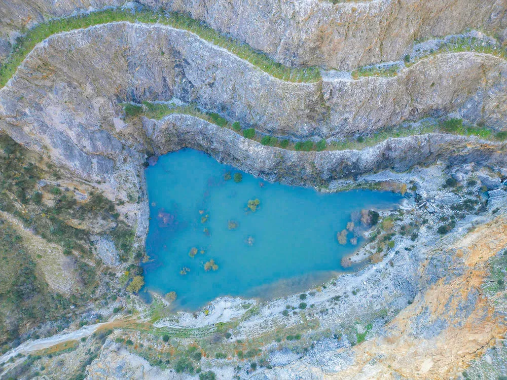 Πριν από πολλά χρόνια σε αυτό το σημείο, λειτουργούσε ένα λατομείο. Αν ερμηνεύσεις σωστά την εικόνα, θα δεις τα σκαμμένα βράχια και τις αναβαθμίδες επάνω τους. Κάποτε όμως το νταμάρι, έπαψε τις εργασίες του σε αυτό το μέρος και μεταφέρθηκε αλλού, αφήνοντας πίσω του ένα λίγο απόκοσμο τοπίο.