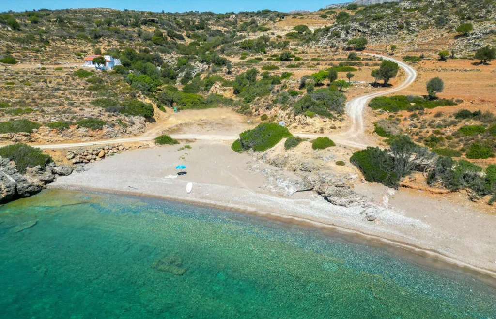 Κάπως έτσι λοιπόν πάει κι εδώ το έργο. Η αμμώδης παραλία με το ελαφρύ βότσαλο σε μερικά σημεία, εκτείνεται σε έναν μικρό όρμο. Η χαμηλή βλάστηση αποτελούμενη κυρίως από θάμνους, έρχεται και δένει με τον κυκλαδίτικο χαρακτήρα. Η φυσική σκιά όπως αντιλαμβάνεσαι είναι περιορισμένη.