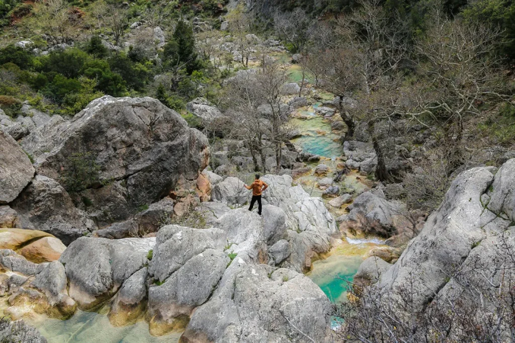 Για το πρώτο επίπεδο θα κινηθούμε δίπλα στο ποτάμι για πέντε λεπτά αλλά όχι από το δρομάκι που μας πήγε στο δεύτερο επίπεδο. Μπορεί να σου ακούγεται λίγο μπερδεμένο αλλά δεν είναι. Παρόλο που δεν υπάρχει σήμανση, σε μια χούφτα τόπο δε χάνεσαι. Άλλωστε θα σε οδηγήσει η βουή του νερού.