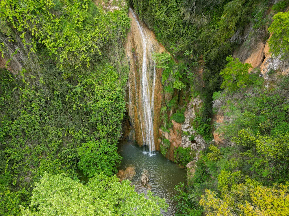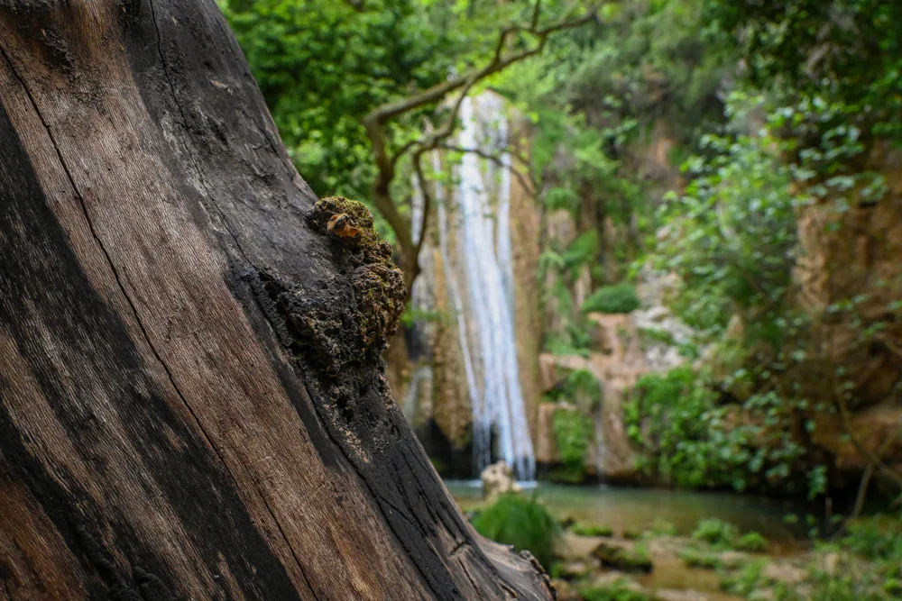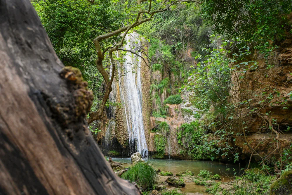 Στο τέλος της διαδρομής, θα έχουμε φτάσει σε ένα χωράφι με ελιές. Εδώ είμαστε! Δεν έχει άλλο δρόμο, μόνο μονοπάτι από δω και πέρα. Η απόσταση από το πάρκινγκ και μέχρι τον καταρράκτη είναι περίπου 500 μέτρα και θα περπατήσεις μόνο ένα τεταρτάκι (το πολύ).