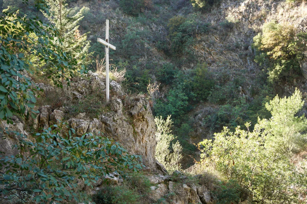 Λίγο μετά τα μισά της διαδρομής, το μονοπάτι χωρίζεται. Ευθεία συνεχίζει για την εκκλησία Σωτήρα (μια πραγματικά πανέμορφη διαδρομή!) και δεξιά για την Παναγία Λαγκαδιώτισσα. Από δω, χρειάζεσαι μόνο 5 λεπτά περπάτημα για το εκκλησάκι του βράχου. Αυτό είναι και το μοναδικό σημείο διακλάδωσης.