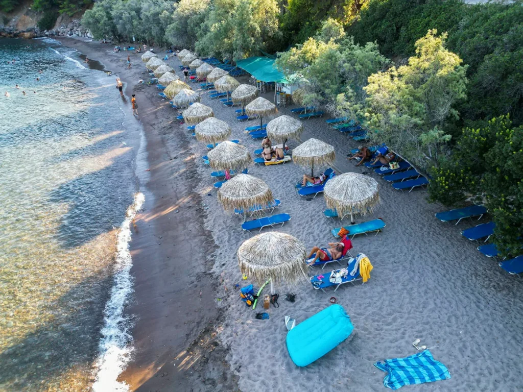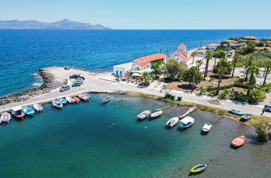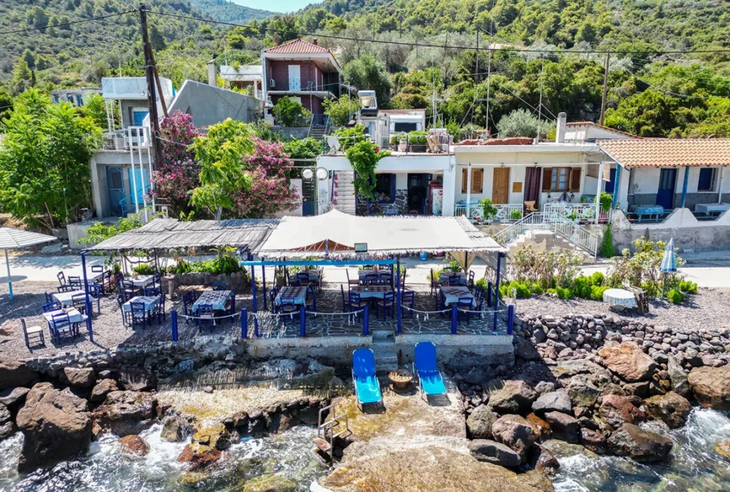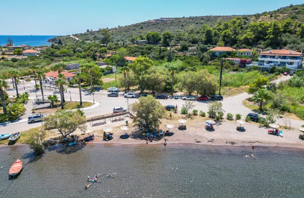 Άραξε στο καφενείο και απόλαυσε καφεδάκι δίπλα στη θάλασσα ή ουζάκι με μεζέ. Αν έχει μεσημεριάσει, τότε ένα γεύμα είναι ό, τι πρέπει σε αυτό τον μίνι παράδεισο. Κολύμπα στα πεντακάθαρα νερά και φτάσε ως τα λουτρά του Παυσανία. Έχεις 15 ολόκληρα λεπτά στη διάθεσή σου να κάνεις το λουτρό σου και να νιώσεις πραγματικά “άλλος άνθρωπος”.