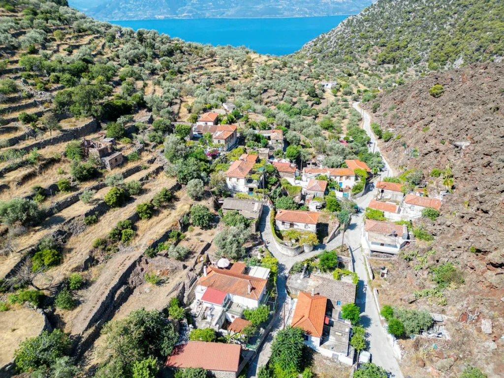 Λίγο παρακάτω, μόλις 1,5 χιλιόμετρο δυτικά, θα συναντήσεις το χωριό Καμμένη Χώρα (όνομα και πράγμα). Αυτός ο οικισμός είναι όντως χτισμένος πάνω στη λάβα που χύθηκε από το ηφαίστειο. Αξίζει μια στάση πριν συνεχίσεις για το κοσμοπολίτικο Βαθύ, μόλις 4 χιλιόμετρα νοτιότερα της Καμμένης Χώρας.