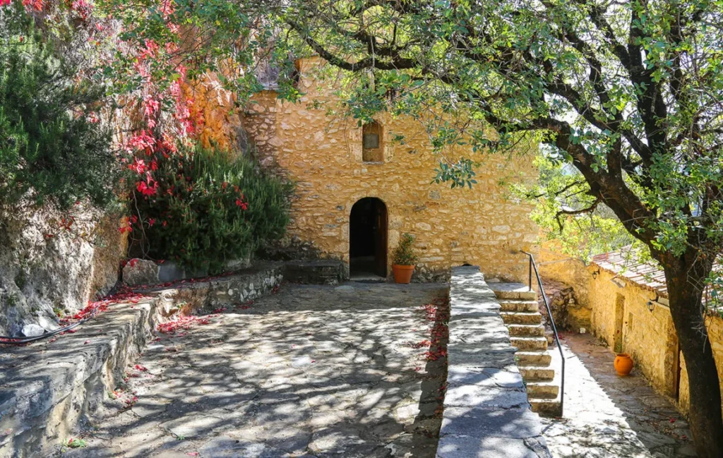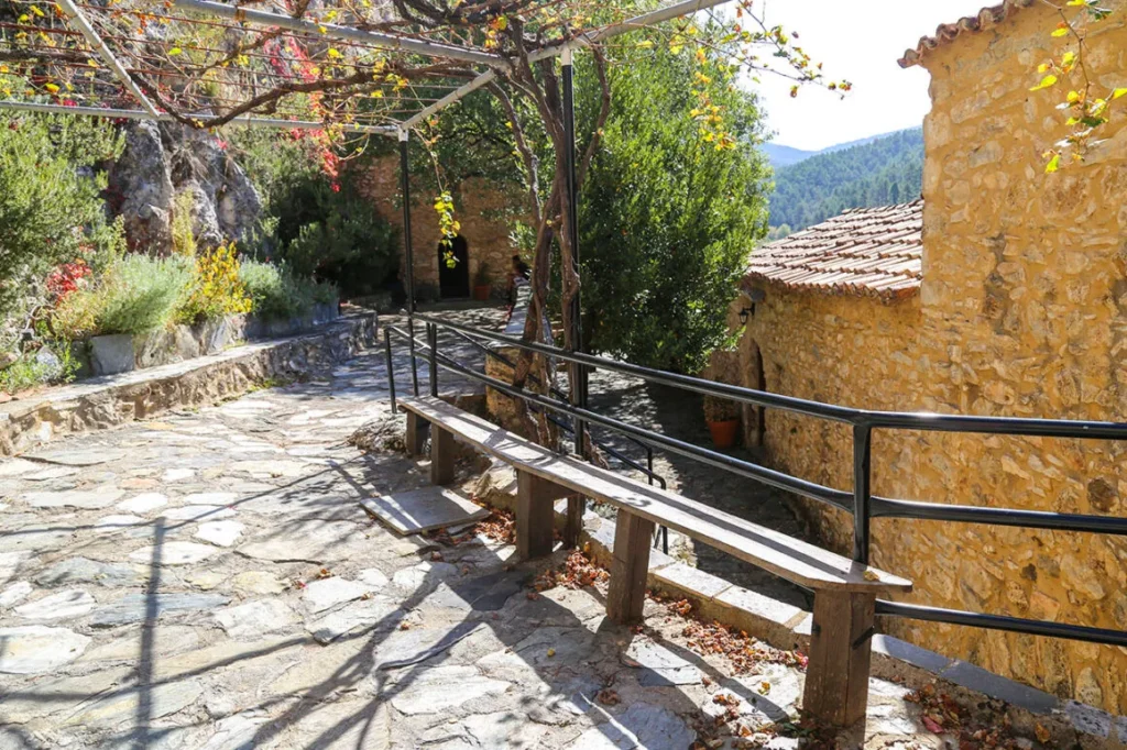 Στο πλακόστρωτο καλντερίμι, 150 μέτρα πριν το μοναστήρι θα συναντήσεις ξύλινα τραπέζια και παγκάκια, που μπορείς να καθίσεις. Ιδίως μετά την άνοιξη, εδώ μοιάζει με όαση δροσιάς.