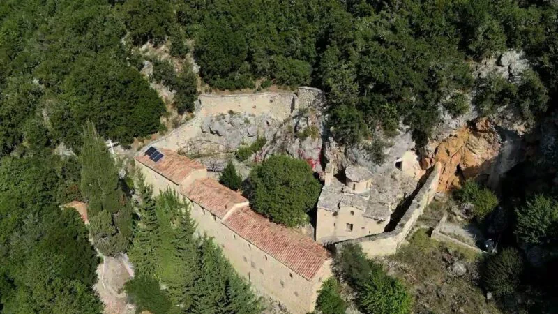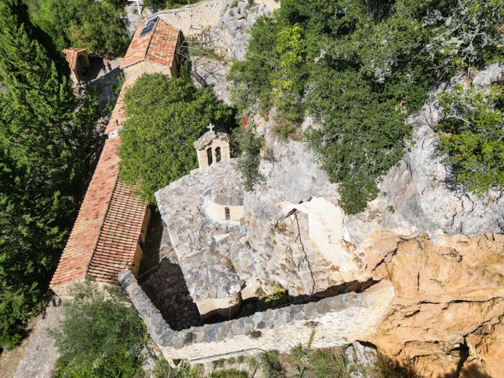 Η σκάλα πίσω από τον ναό, οδηγεί στο ασκηταριό, στην κοιλότητα του βράχου. Η μικρή σπηλιά, έχει διαμορφωθεί σαν ένα μικρό εκκλησάκι. Η θέα από δω, όπως σωστά υποψιάζεσαι είναι τουλάχιστον… εντυπωσιακή. Αν αφήσεις ελεύθερες τις σκέψεις σου και καταφέρεις να δεις το θαύμα που αποκαλύπτεται μπρος στα μάτια σου, ίσως καταλάβεις εκείνη τη βαθιά ανάγκη των μοναχών, να απαρνούνται κάθε τι γήινο κι ανθρώπινο.