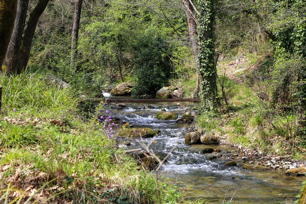 Καταλαβαίνουμε πως είμαστε στο Βρυσιώτικο φαράγγι, από τα πανύψηλα βράχια που υψώνονται ξαφνικά μπροστά μας και τους εντυπωσιακούς χρωματισμούς τους. Το νερό που αναβλύζει από την πηγή σε αυτό ακριβώς το σημείο, δημιουργεί το ποτάμι που βλέπαμε, καθ’ όλη τη διάρκεια της πεζοπορίας μας.